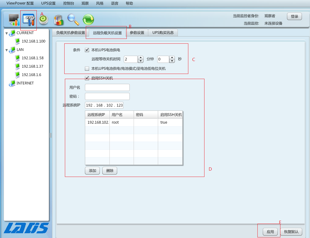 2、如果要在交流故障時關(guān)閉ESXi,請轉(zhuǎn)到UPS設(shè)置 》遠程關(guān)機頁面,請參考A和B部分。然后選擇關(guān)機條件,并設(shè)置關(guān)機時間,參考C部分,并將ESXi服務器IP地址添加到IP列表,參考D.的部分。最后單擊“應用”按鈕保存配置。